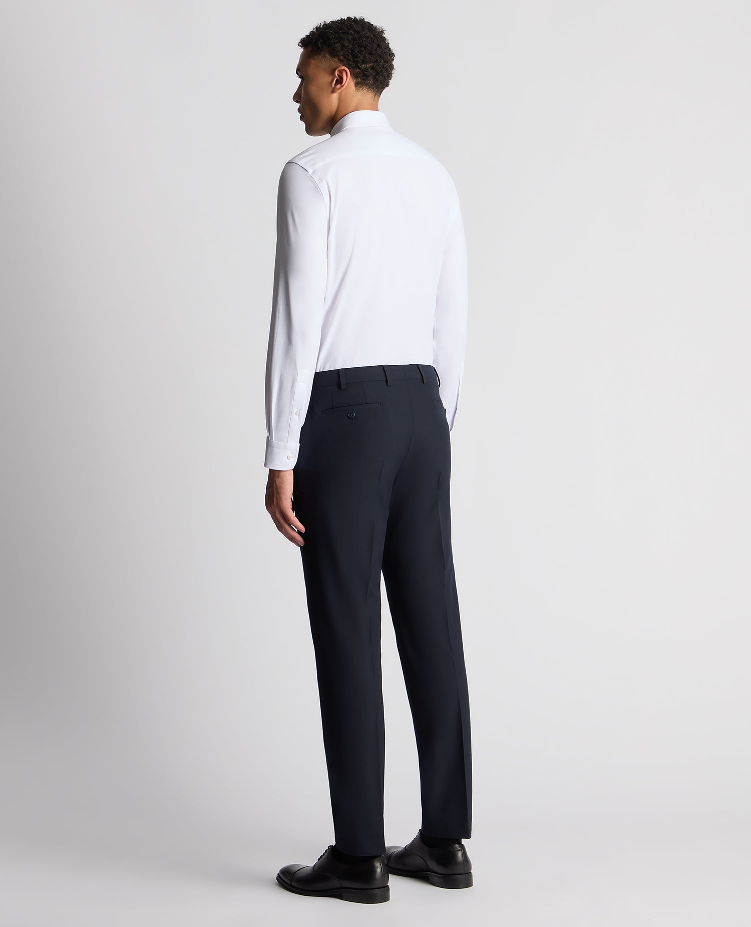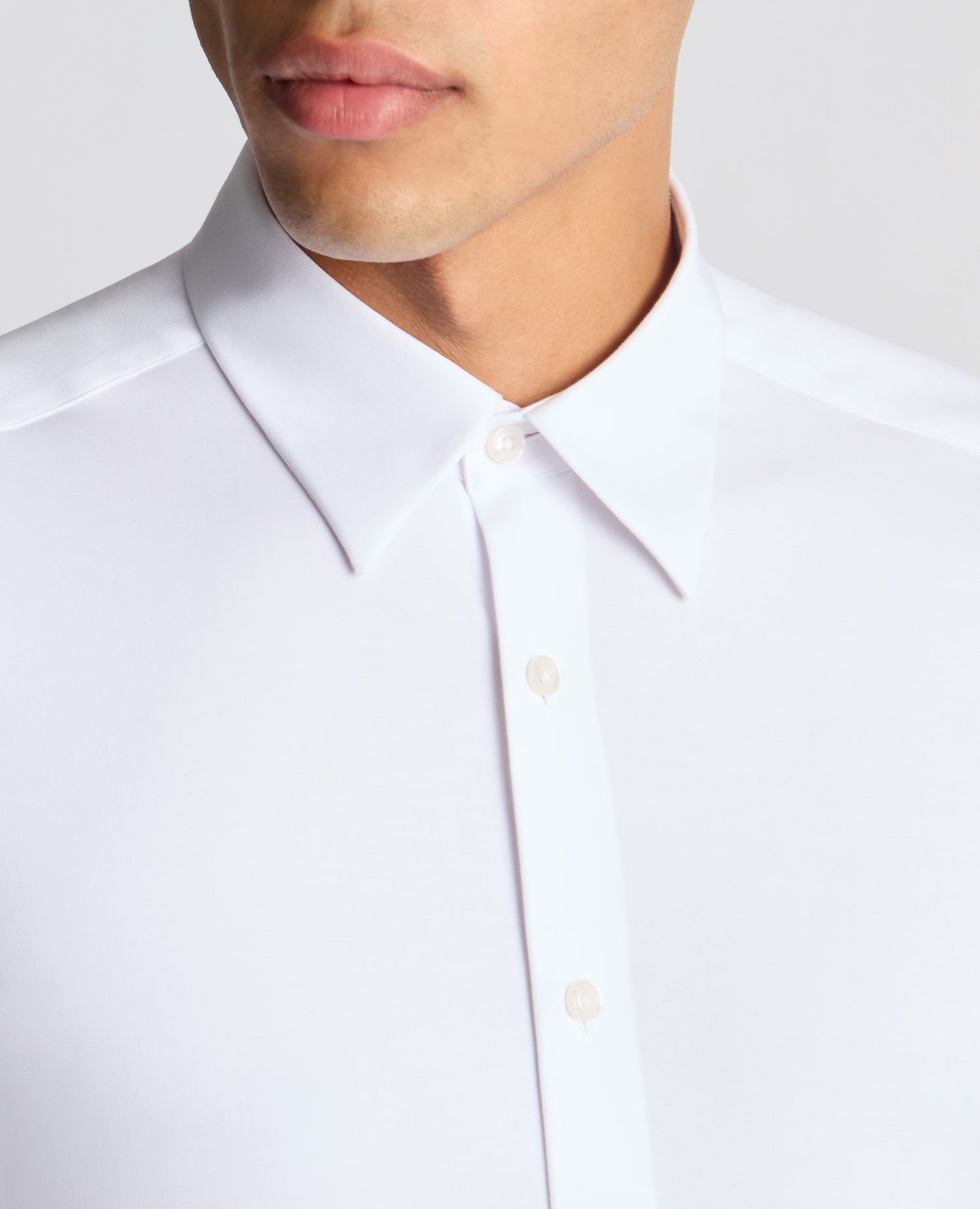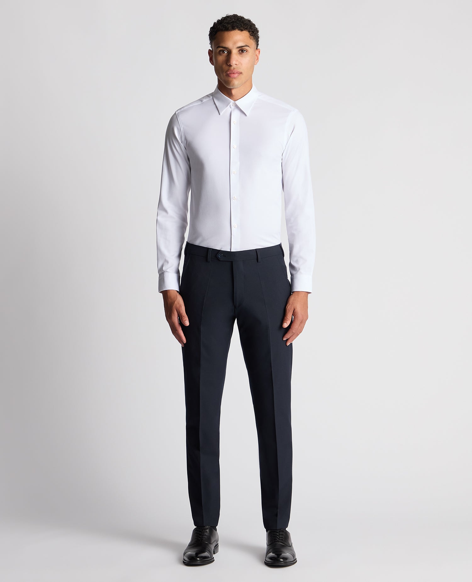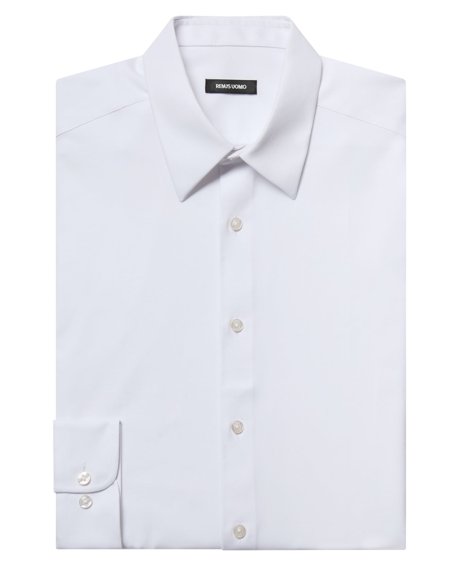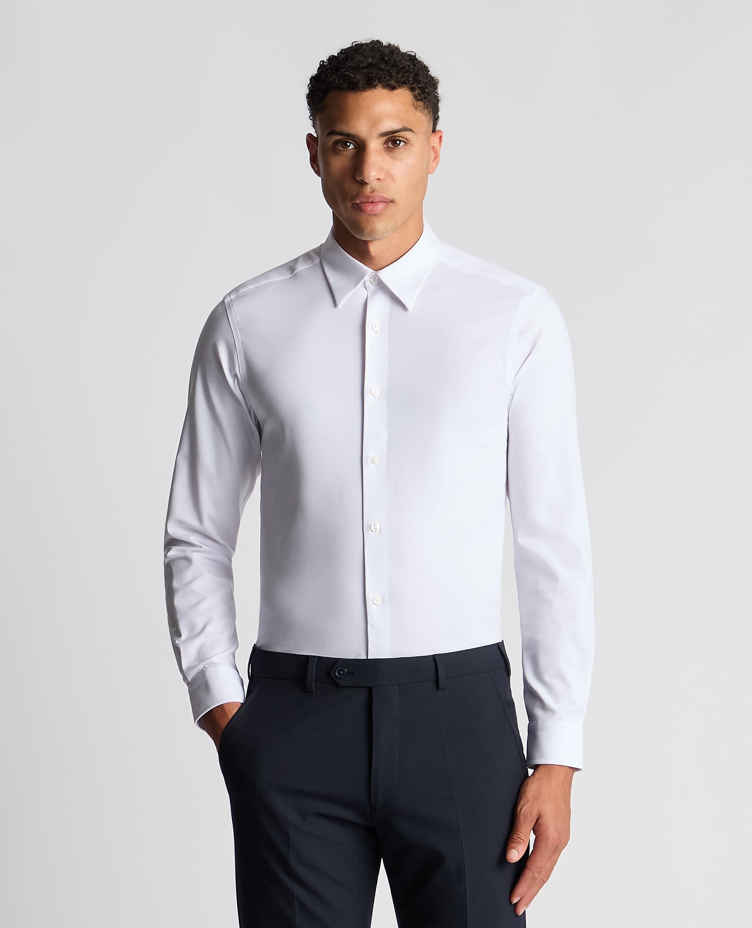 The Jenson white fine woven twill regular fit shirt, crafted in our comfort stretch fabric, offers ultimate comfort with a blend of cotton and Spandex. This shirt features a more fitted cut across the chest and arms, with a generous fit along the torso and waist. It includes a pointed collar with a contemporary bluff edge shape and lightweight interlining. Finished with a french front button closure, rounded cuffs, and tailed hem complete the look.