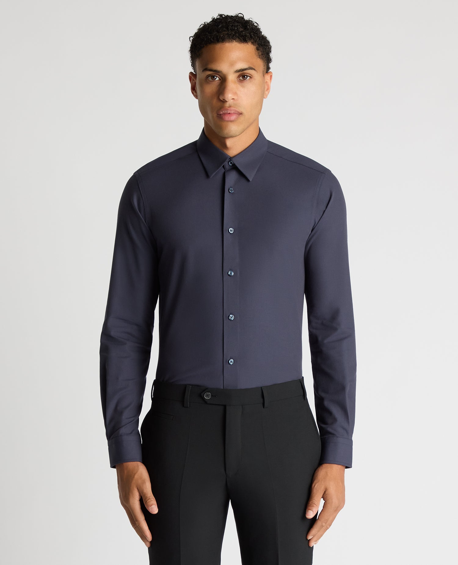 The Jenson navy fine woven twill regular fit shirt, crafted in our comfort stretch fabric, offers ultimate comfort with a blend of cotton and Spandex. This shirt features a more fitted cut across the chest and arms, with a generous fit along the torso and waist. It includes a pointed collar with a contemporary bluff edge shape and lightweight interlining. Finished with a french front button closure, rounded cuffs, and tailed hem complete the look.