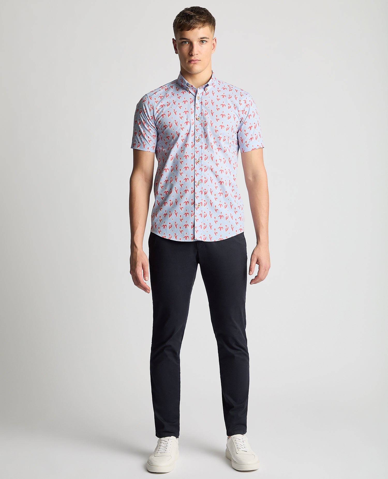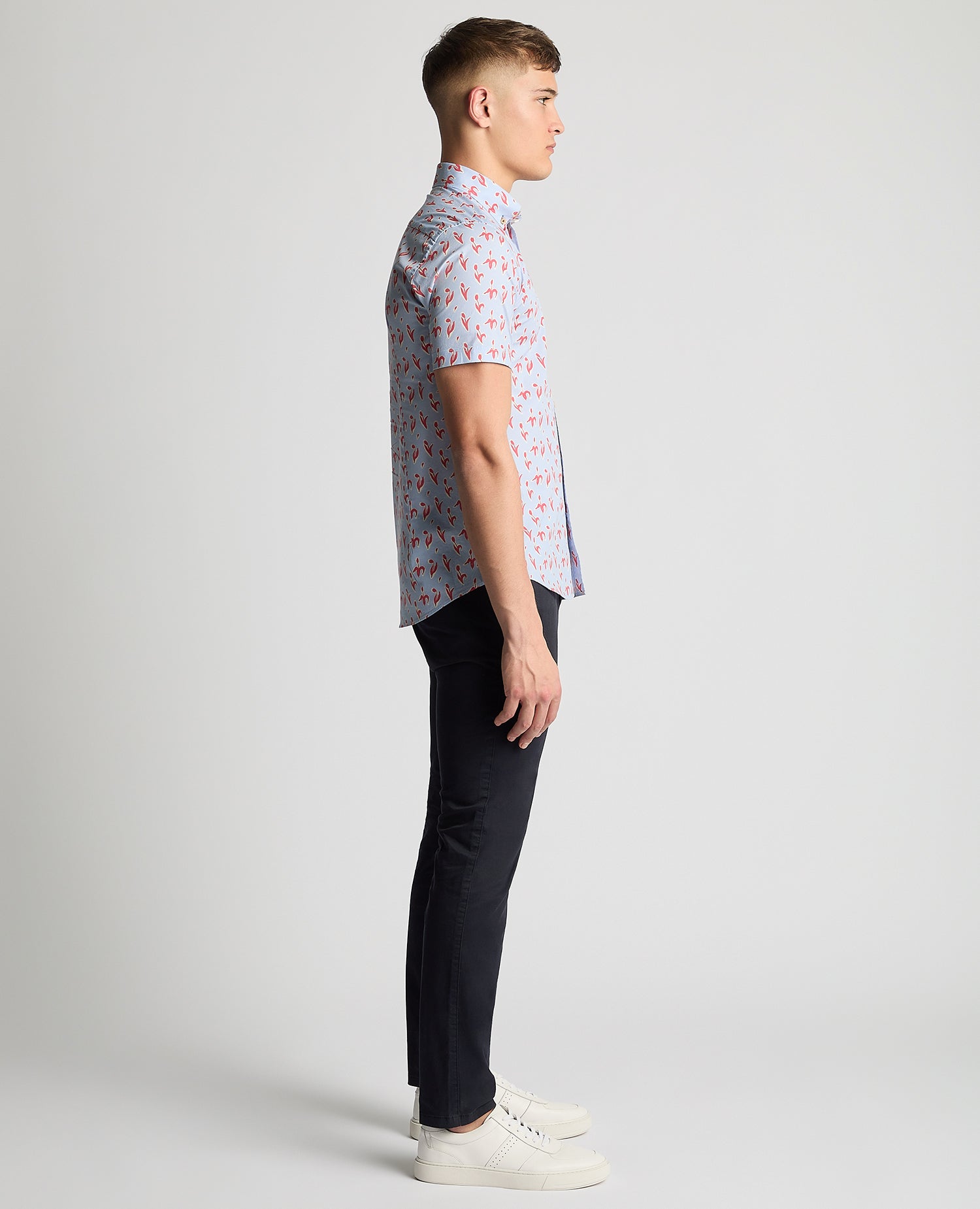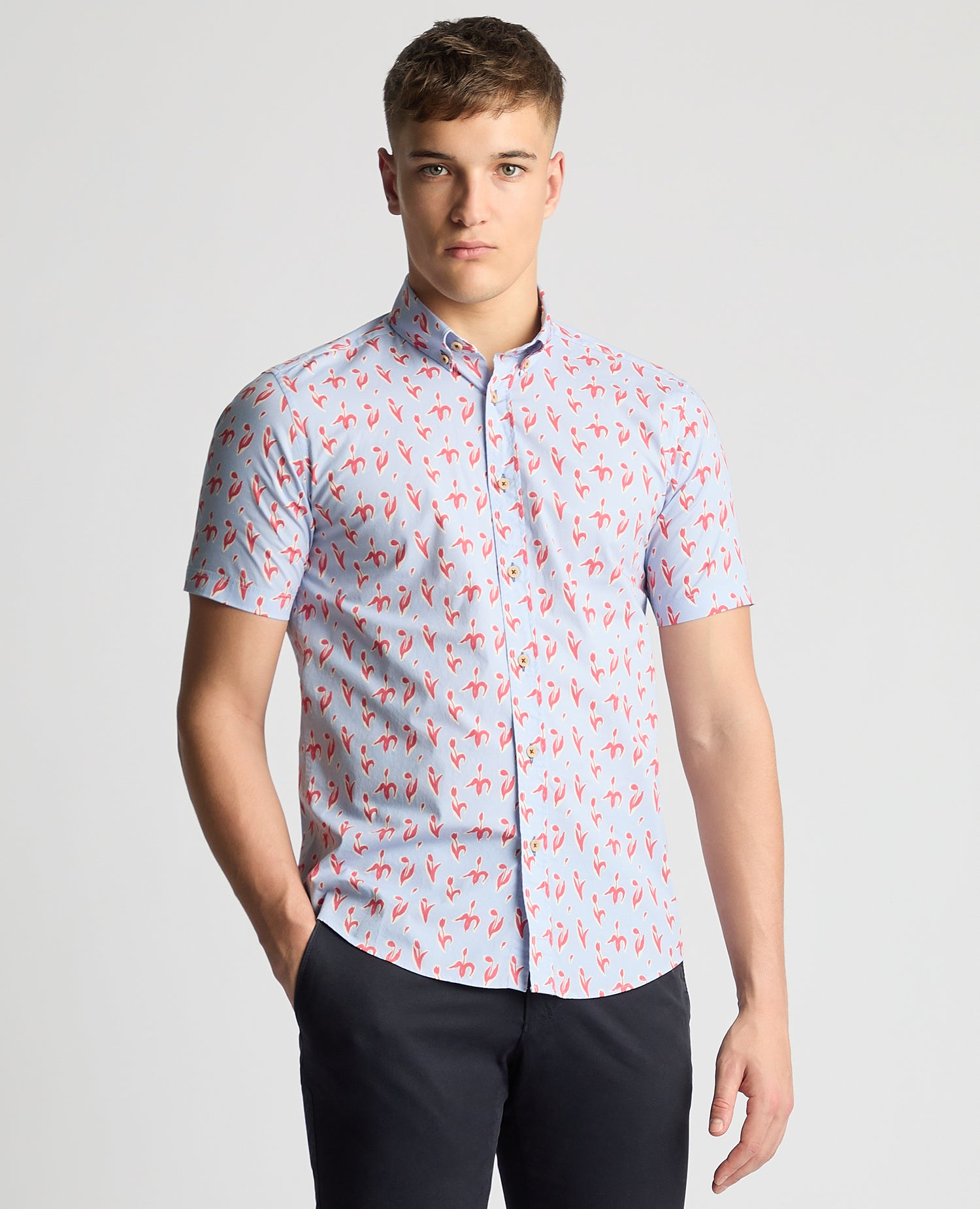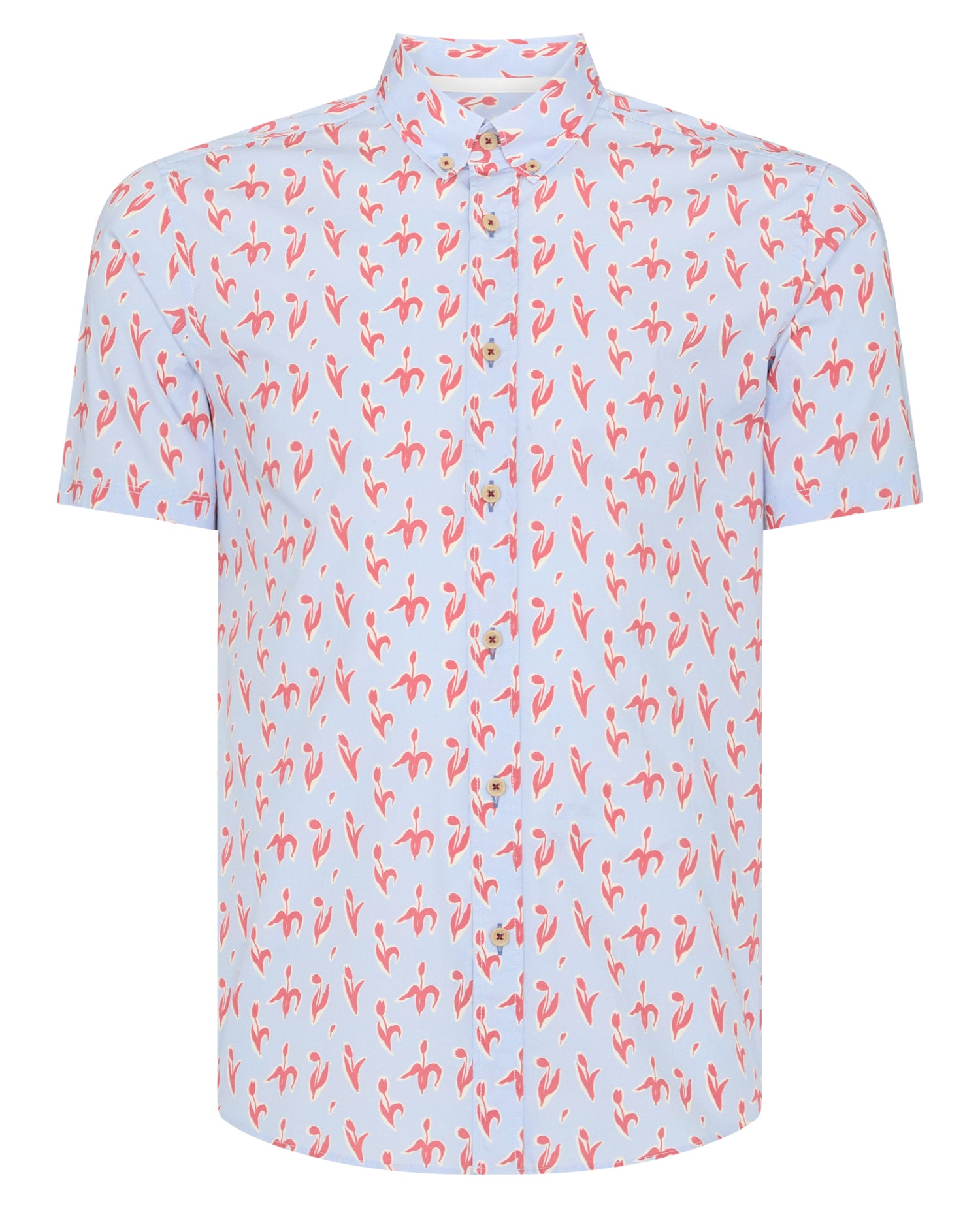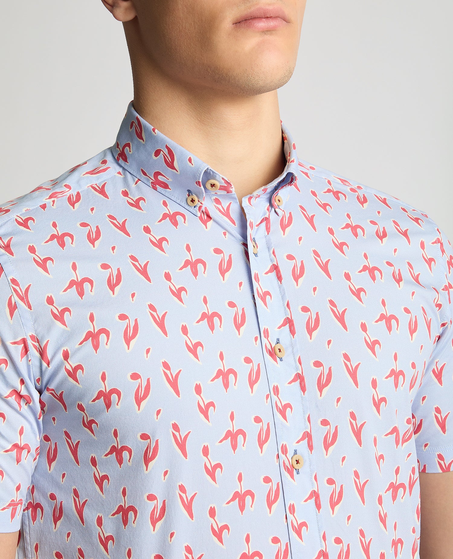 Blue cotton-stretch short sleeved shirt with red and white floral print. Buttoned down collar and front placket, back yoke look and tailed hem..