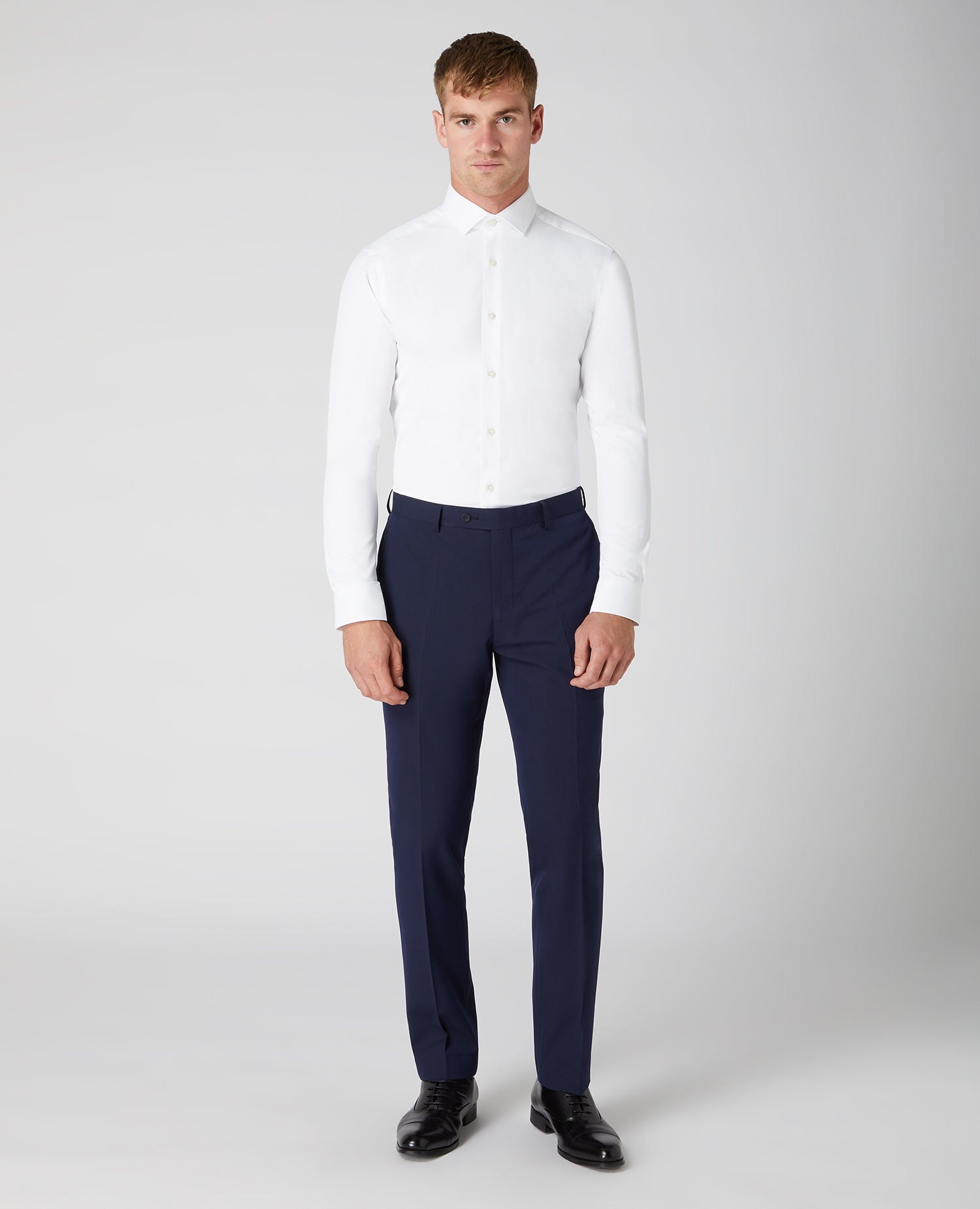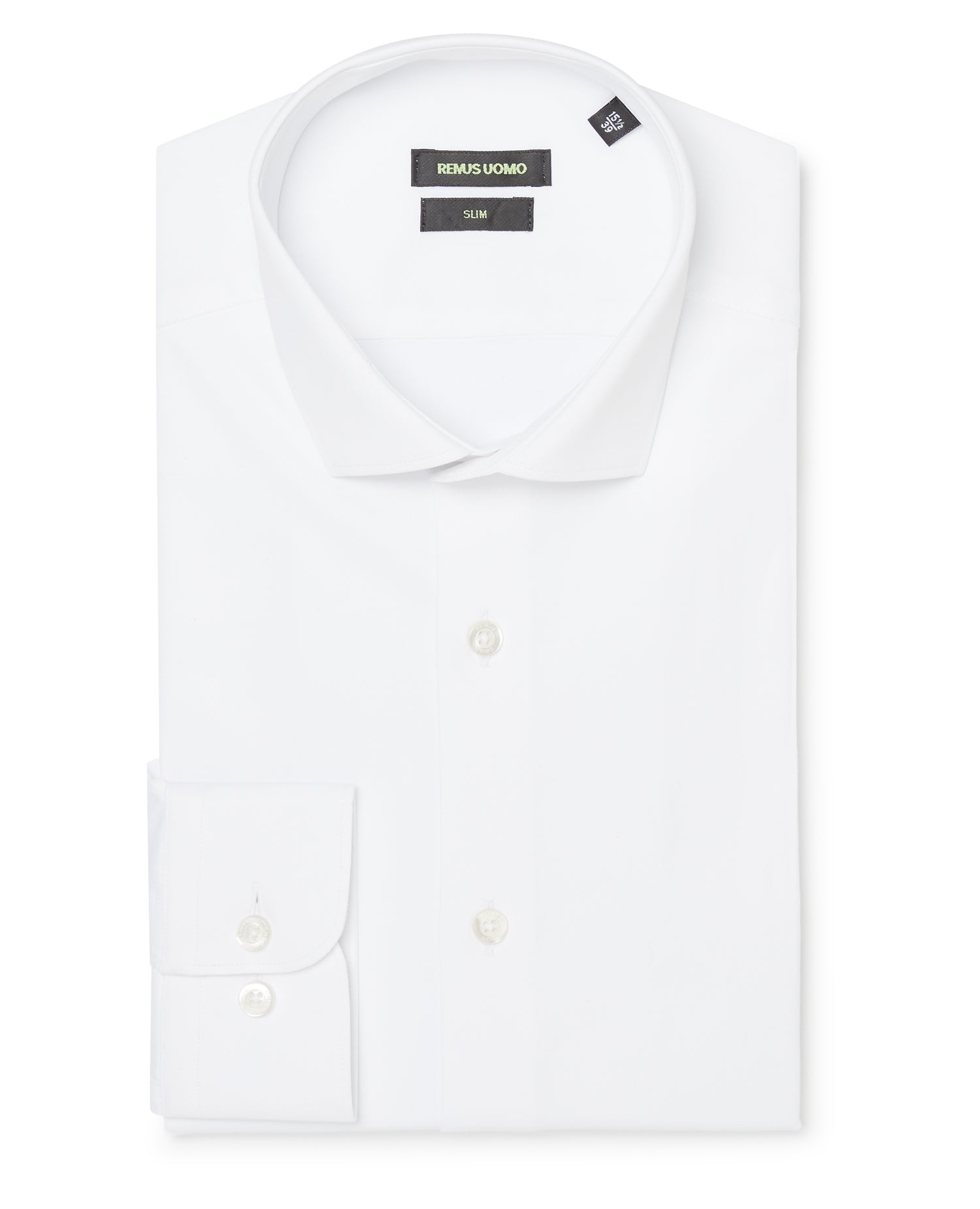 White slim fit cotton stretch long-sleeved shirt with french front and spread collar