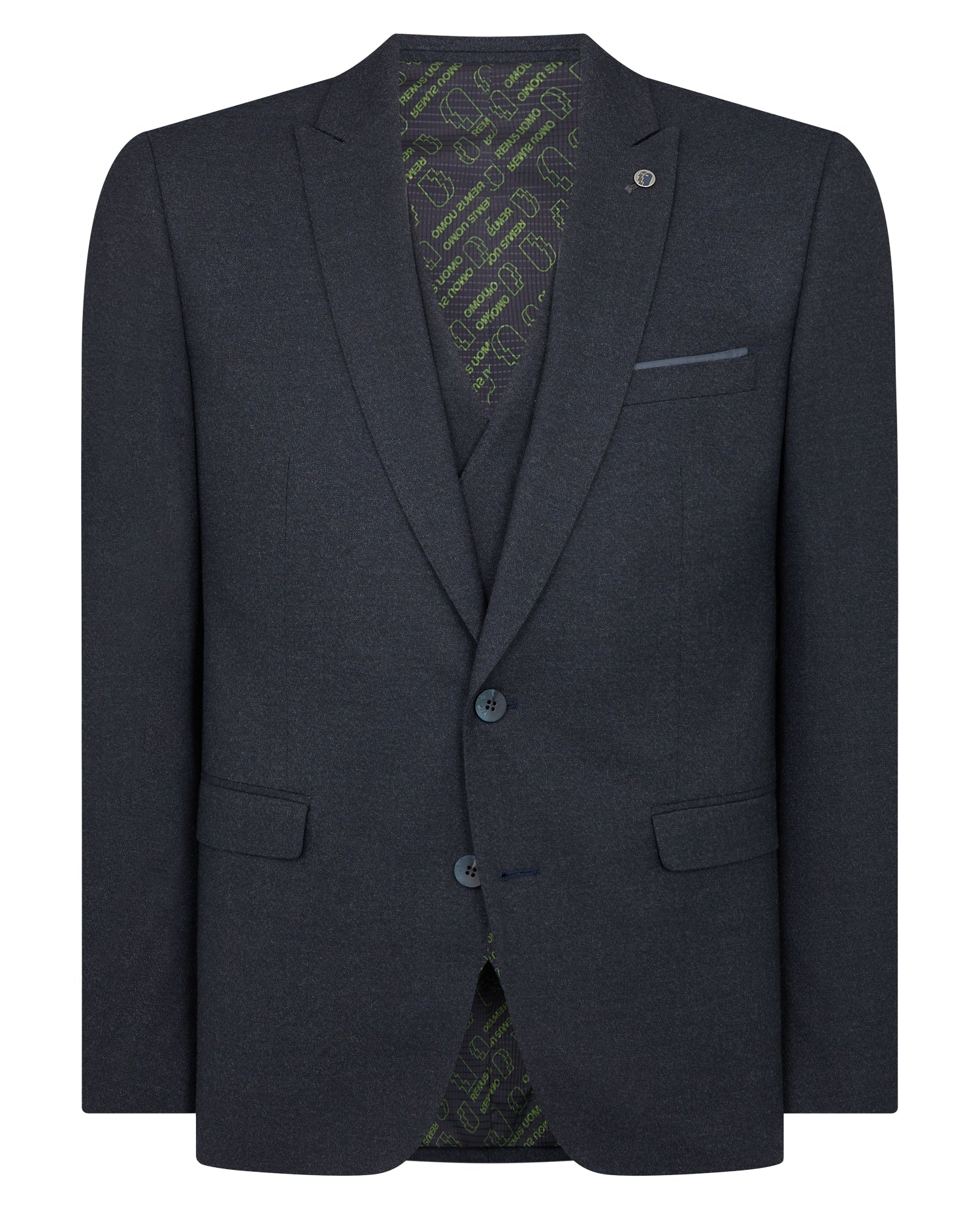 Navy slim fit stretch suit jacket with semi-plain with peak lapel. Single breasted, button two with straight flap side pockets and side vents.