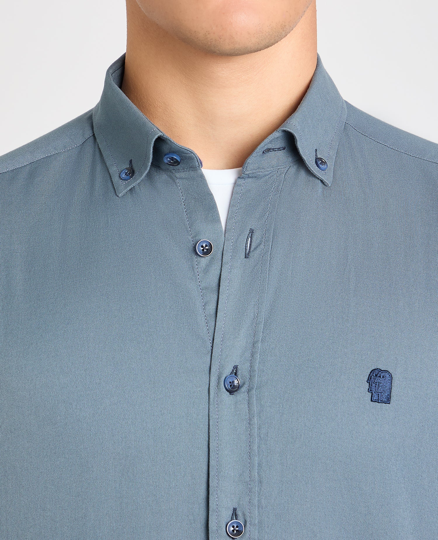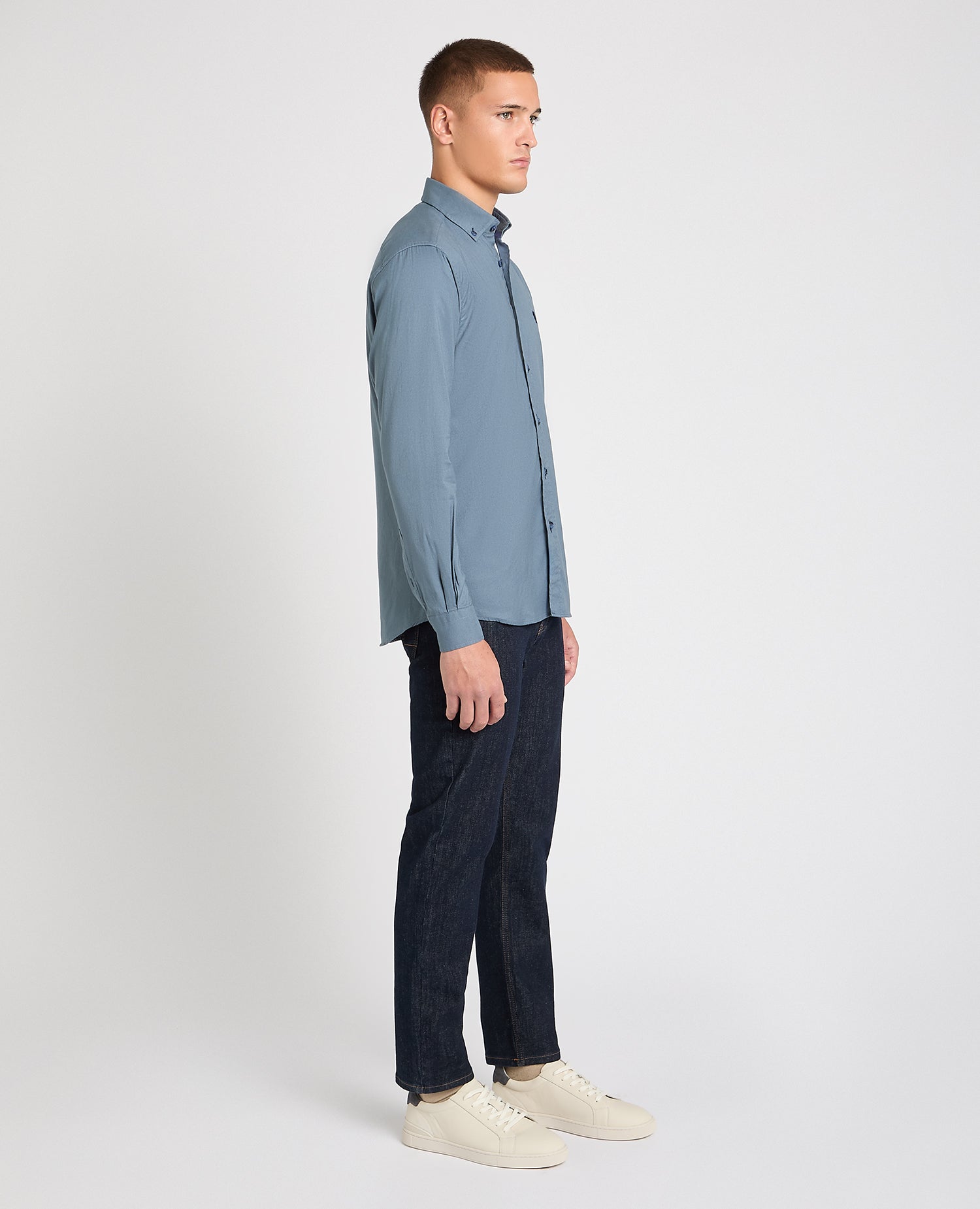 Blue tapered fit oxford cotton shirt with a pointed button down collar, placket front with an inverted back pleat, back yoke loop and tailed hem. Contrasting embordered brand mark on chest.