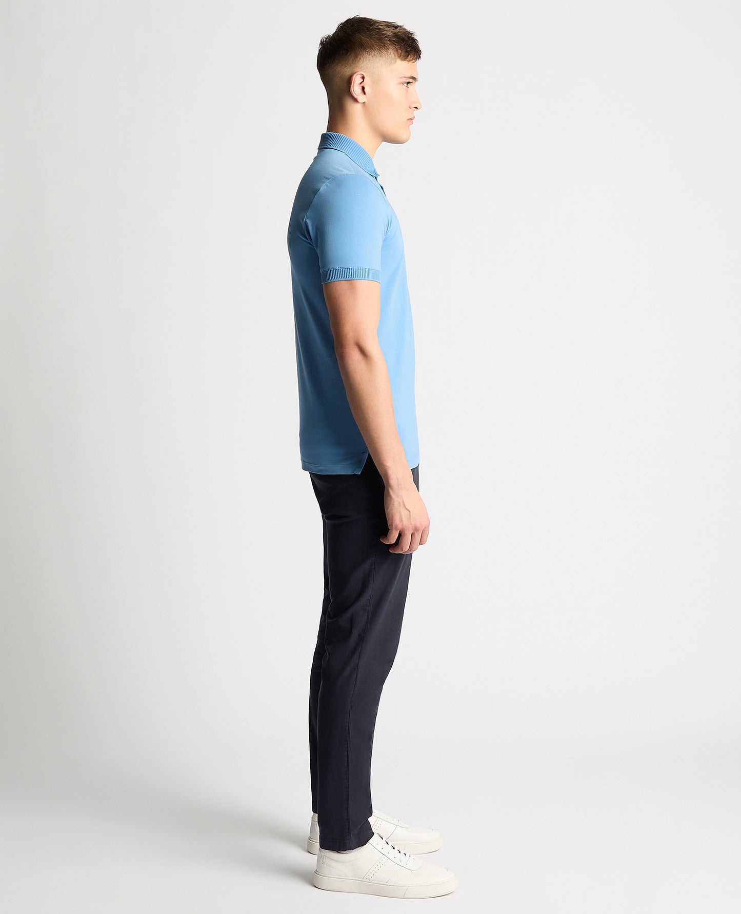 Blue tapered fit cotton-stretch polo shirt with stretch, with three button closing and feature ribbed collar and cuff.