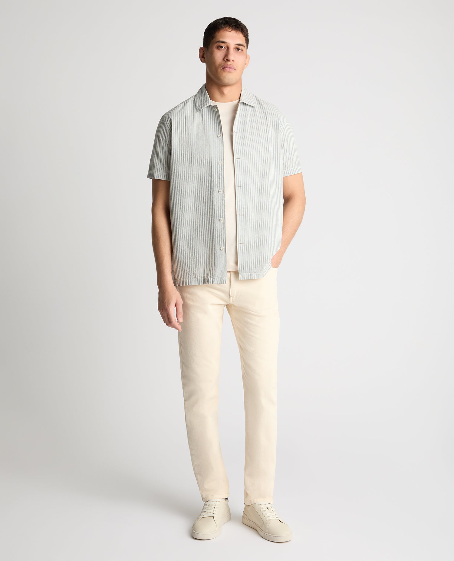 A shirt that requires zero overthinking, just let the two-tone stripe do the talking. This piece adds just enough character to lift any look, while the cotton linen blend keeps things light and comfortable all day. Easy, confident, and made for warmer days.